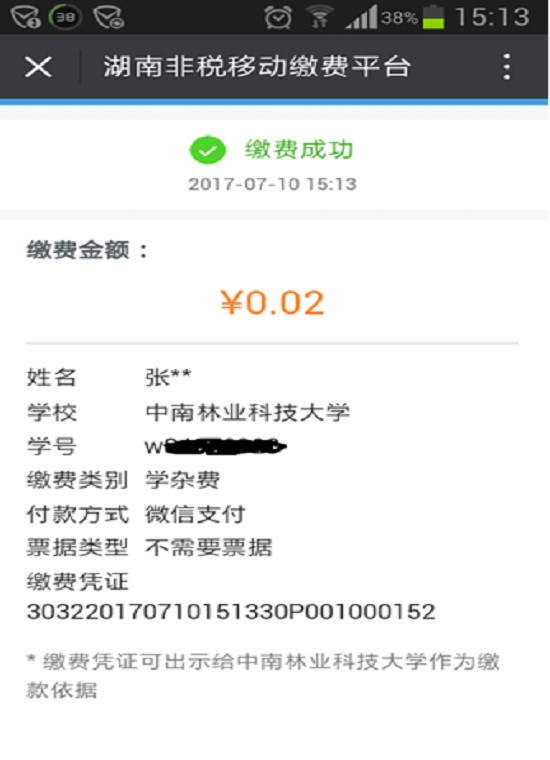 6、支付成功后会显示“缴费成功”。学生可以在5分钟后重新登录,已缴清费用的会显示“已缴清”信息,点击右上角的“交易记录”会显示缴费记录。