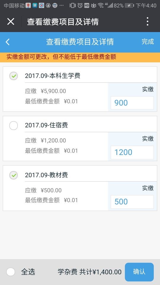 4、如需查看费用明细项目或分次缴费(助学贷款学生或应缴金额大于10000元的学生),请点击“查看缴费项目及详情”。在此可选择缴费项目,点击“编辑”可修改实缴金额:将“○全选”中的“√”去掉,点击具体收费项目,进行缴费项目选择,再点击右上角“编辑”进行缴费金额修改(实缴金额不能大于应缴金额,也不能小于最低缴费额),点击“确认”后回到缴费界面缴费。