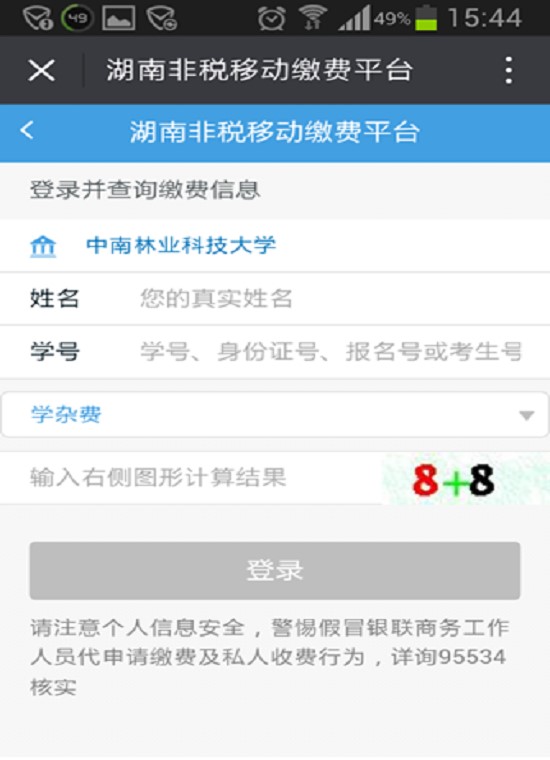 2、点击“在线缴款-旧版入口”后,点击“教育”,选择“中南林业科技大学”进入登录界面后,输入学生姓名、学号(身份证号),缴费类型有“学杂费”、“重修费”、“报名考试费”等,缴费时请选择相应缴费类型并点击“登录”。